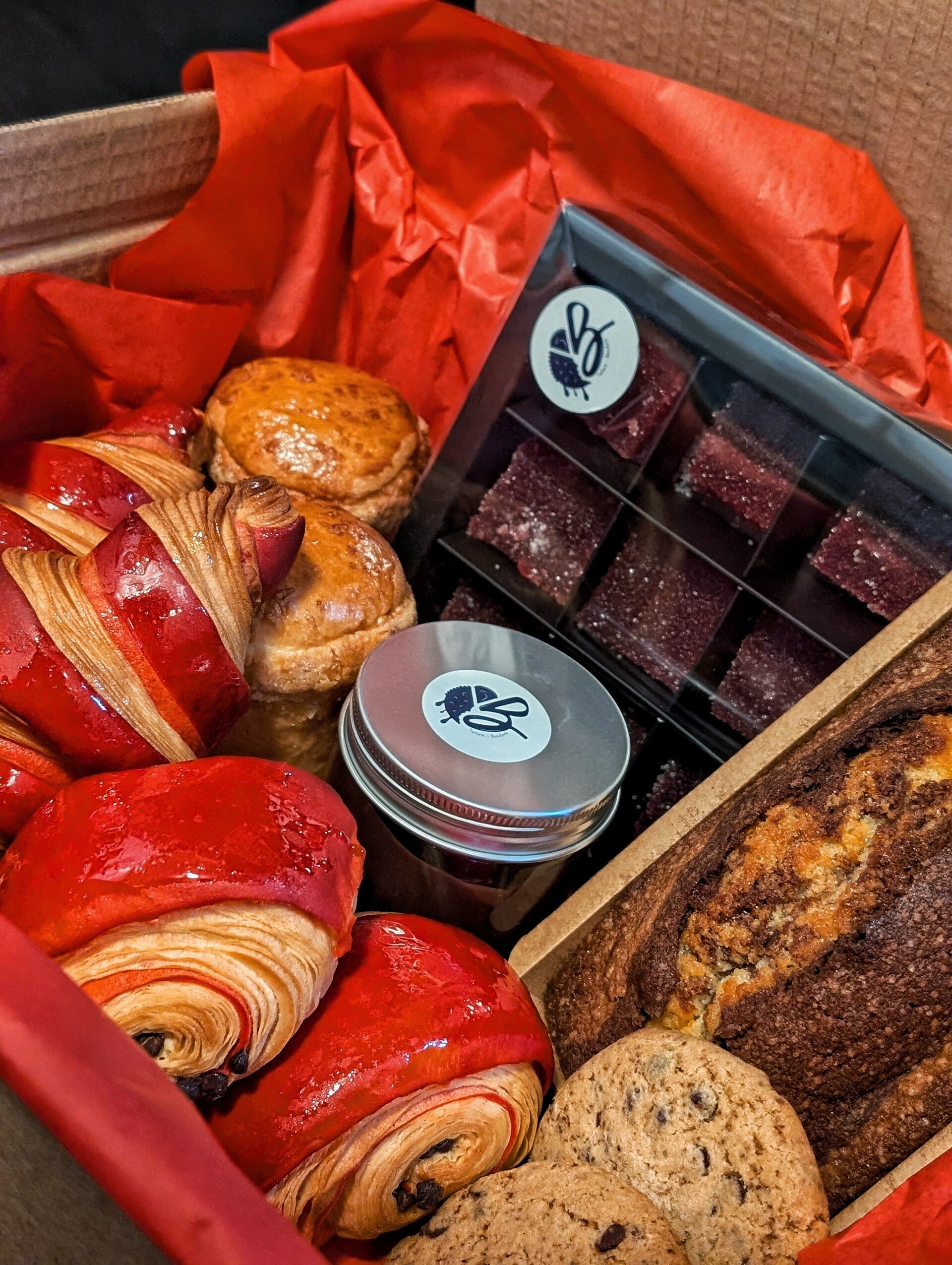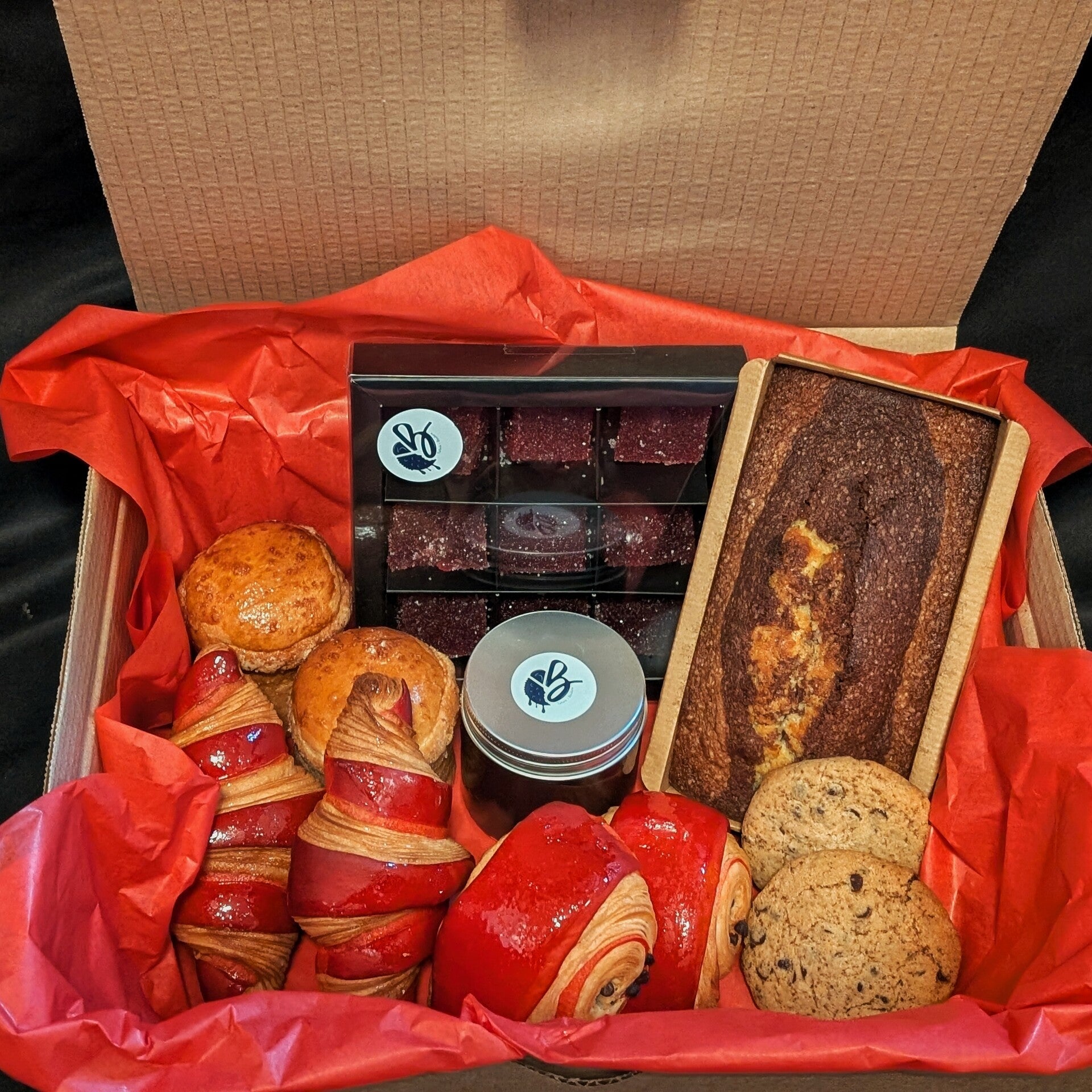 2 mini croissants 2 mini pains au chocolat 2 cookies 1 cake marbré 1 boîte de 9 pâtes de fruits framboise 1 pot de pâte à tartiner maison 2 brioches